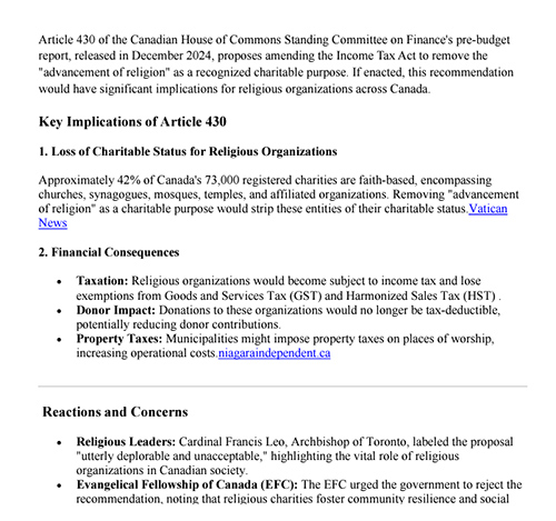 실제로 Recommendation 430이 채택돼 법으로 시행되면 캐나다 전역의 종교 단체, 특히 교회들은 '자선 단체(Charity)' 지위를 상실하게 된다. 현재 등록된 약7만3천개의 캐나다 자선단체 중 42%인 약 3만개가 교회, 회당, 모스크, 사찰 등 신앙 기반 단체들인데, '종교의 증진'이 자선 목적으로 인정되지 않으면, 이들 대부분이 자선 단체 지위를 박탈당해 더 이상 소득세, 상품 및 서비스세(GST) 및 통합 판매세(HST) 면세 혜택을 받지 못하고 과세 대상이 될 수 있다.