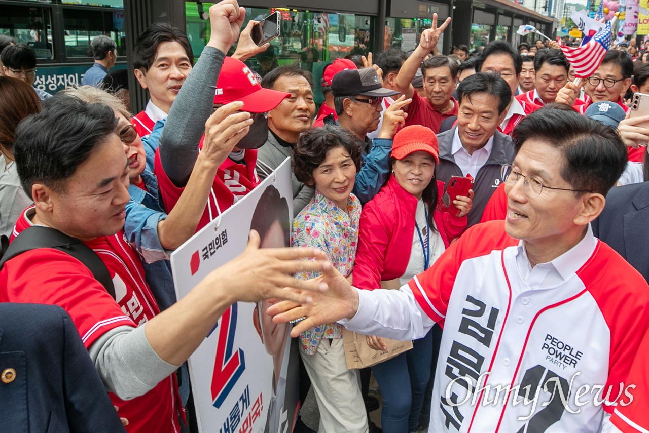 ▲김문수 국민의힘 대선 후보가 16일 천안시 동남구 신세계백화점 앞에서 시민들과 인사하고 있다. ⓒ 공동취재