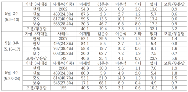 이번 대선에서 분석할 리얼미터 조사는 5월 2주 차, 5월 3주 차, 5월 4주 차 등 3개 조사이다. 3자 가상대결을 중심으로 살펴본다.
