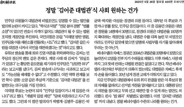 한때 제 입으로나마 민족 정론지라던 방씨조선일보에게 몰락의 끝은 어디일까? 5월 26일 사설 제목은 그야말로 목불인견(目不忍見)이다. “‘김어준 대법관’식 사회 원하는 건가”, 일등 신문을 강변하던 알량한 자존심도 던져 버린 지 오래다. 그저 선정적이고 자극적인 제목으로 이른바 클릭 수 장사만 하면 그만이라는 속셈이 아니라면 도저히 받아들이기 어렵다. 신문의 얼굴일 수 있는 사설에서조차 자신들이 증오하는 특정 유튜버의 이름을 거론하며 선동질하는 방씨조선일보를 보며 위선적인 품격조차 잃은 노회하고 추레한 언론 가장 범죄집단의 씁쓸한 뒷모습을 떠올리게 된다.