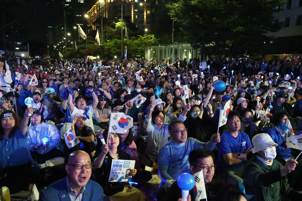 이날 여의도 광장에서 개표 중계방송을 시청하던 민주당과 지지자들은 오후 10시 59분 투표 결과가 '이재명 당선 유력'으로 뜨자 민주당 상임총괄선거대책위원장들이 나와 국민들에게 감사의 마음을 표현했다. 박찬대 위원장은 "지난 12월 3일 190명 국회의원이 장갑차와 총칼을 막아선 국민을 의지해 계엄을 해제한 곳이 바로 이곳"이라며 "투표 불성립 이후 200만 명 달하는 국민이 여의도에 와서 탄핵소추안을 가결하게 만든 곳도 여의도"라고 말했다. 그러면서 "여러분이 들어올린 소중한 응원봉과 빛의 혁명이 6개월 동안 지속된 결과 내란을 종식하고 진짜 대한민국을 만들게 된 것"이라며 "이재명과 함께 우리 국민과 함께 진짜 대한민국을 만들어 냅시다"고 말했다.