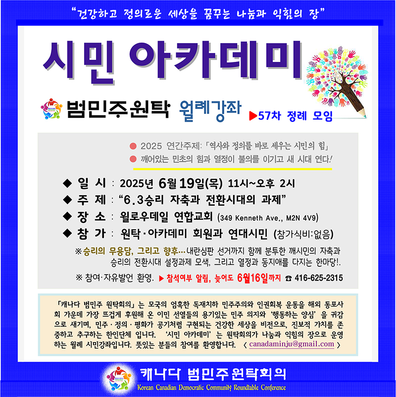 캐나다 범민주원탁회의(Korean Canadian Democratic Community Roundtable Conference)가 6월 연합모임을 겸한 월례 「시민 아카데미」의 제57차 강좌를 6월19일(목) 오전 11시부터 노스욕 윌로우데일 연합교회(349 Kenneth Ave. M2N 4V9)에서 시사한겨레 신문사 후원으로 개최한다.
