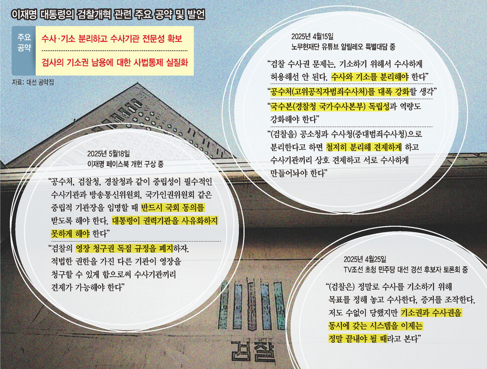 지난 11일에는 민주당 의원 14명이 ‘검찰 개혁 4법’을 발의했다. 중수청은 행정안전부, 공소청은 법무부 산하에 설치하고, 국무총리 직속 국가수사위원회가 중수청, 경찰청 국가수사본부, 고위공직자범죄수사처(공수처) 업무를 조정·관리·감독하도록 했다. 중대범죄수사청은 8대 중대범죄(내란 및 외환, 부패, 경제, 공직자, 선거, 방위사업, 대형 참사, 마약)를 수사하며, 공수처는 고위 공직자의 주요 범죄를 맡고, 국가수사본부는 모든 수사가 가능하다. 공소청은 기소와 공소유지를 담당하고 영장청구권을 갖는다. 수사·기소권 분리라는 이 대통령의 검찰 개혁에 부합하는 내용이다. 앞으로 당·정 협의 등을 통해 최종적인 검찰 개혁안이 도출될 것으로 보인다.