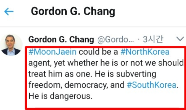 고든 창이 자신의 SNS에 올린 글. "문재인은 북한 요원(agent)일 수 있다"고 쓴 뒤 곧바로 "북한 요원이건 아니건, 우리는 문재인을 북한 요원으로 대우해야 한다. 그는 자유와 민주주의와 한국을 전복하고 있다"라고 썼다. 본인 스스로 아무런 근거 없이 색깔론을 펼치고 있음을 백일하에 고백한 꼴이다. [[고든 창 SNS계정] 시민언론 민들레