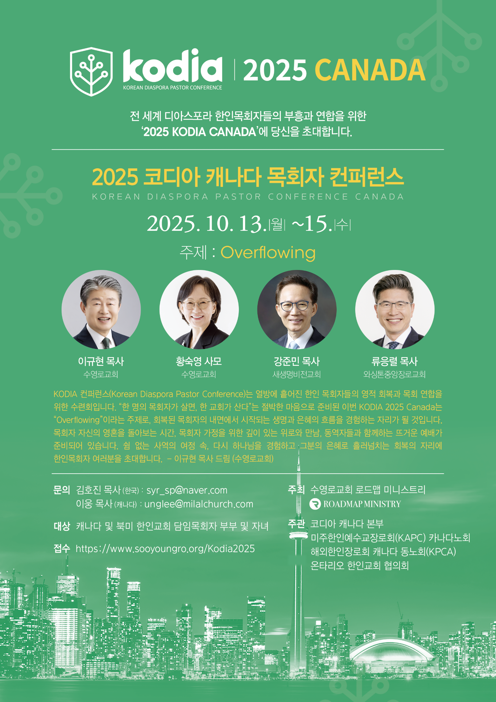 “디아스포라 한인목회자들의 부흥과 연합을 위한” 2025 코디아(KODIA) 캐나다 목회자 컨퍼런스(Korean Diaspora Pastor Conference)가 오는 10월13일(월)부터 15일(수)까지 토론토 쉐라톤호텔에서 열린다.