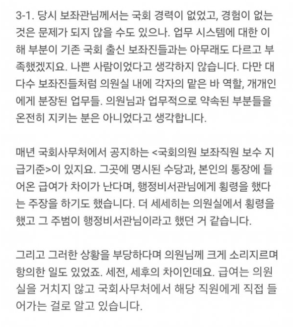 나아가 "매년 국회사무처에서 공지하는 <국회의원 보좌직원 보수 지급 기준>이 있다. 그곳에 명시된 수당과 본인의 통장에 들어온 급여가 차이가 난다며 행정비서관에게 횡령을 했다는 주장을 하기도 했다"면서 "그런 상황이 부당하다며 의원님께 크게 소리 지르고 항의한 일도 있었다. 의원실에서 횡령을 했고, 그 주범이 행정비서관이라고 했던 거 같다. 세전(稅前), 세후(稅後)의 차이인데. 급여는 의원실을 거치지 않고 국회 사무처에서 해당 직원에게 직접 들어가는 걸로 알고 있다"고 어이없었다는 뉘앙스로 전했다.
