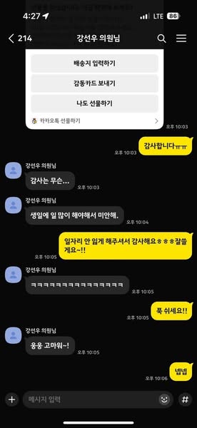 앞서 또 다른 전직 보좌진은 강 후보자가 손글씨로 쓴 '든든하게 늘 그렇게 있어줘서 정말 고맙다' '더 즐겁게, 잼있게 지내자!' 등의 문구가 적힌 카드 사진과, '생일에 일 많이 해야 해서 미안해'라며 보내온 카카오톡 선물 메시지를 공개하기도 했다. 이와 함께 "강선우 의원님이 직원들을 대하는 방식은 늘 격의 없고 수평적이었다"면서 "지금은 어떨지 모르겠지만 여러 기념일, 휴가철마다 직원 한 명 한 명 직접 챙기며 손수 메모를 적어 선물을 주셨던 것도 기억난다. 직원들 생일 때마다 사무실에 케이크를 준비해와서 박수 치고 함께 축하해주던 기억도 난다"는 글을 올렸다.