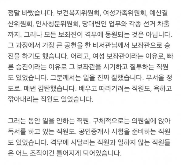 "정말 바빴다. 보건복지위원회, 여성가족위원회, 예산결산위원회, 인사청문위원회, 당 대변인 업무와 각종 선거 차출까지. 그러나 모든 보좌진이 격무에 동원되는 것은 아니다. 그 과정에서 가장 큰 공헌을 한 비서관님이 보좌관으로 승진을 하기도 했다. 어리고, 여성 보좌관이라는 이유로, 빠른 승진이라는 이유로 그 보좌관을 시기하고 질투하는 직원도 있었다. 그분은 일을 진짜 잘했다. 무서울 정도로. 매번 감탄했다. 배우고 따라가려는 직원도, 욕하고 깎아내리는 직원도 있었다. 그러는 동안 일을 안 하는 직원. 구체적으로는 의원실에 앉아 독서를 하고 있는 직원도, 공인중개사 시험을 준비하는 직원도 있었다. 격무에 시달리는 직원과 일하지 않는 직원들은 어느 조직이건 틀어지게 되어있다."