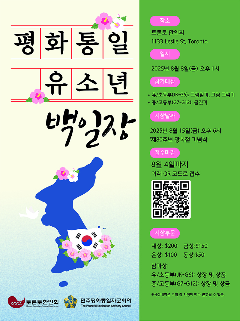 토론토 한인회(회장 김정희)와 민주평통 토론토협의회(회장 유건인)가 공동으로 주최하는 GTA지역의 JK에서 G12까지의 어린이와 청소년을 대상으로 “정체성과 평화의 가치를 그림과 글로 담는” ‘2025 평화통일 유소년 백일장대회’가 8월8(금) 오후 1시부터 한인회관에서 열린다.