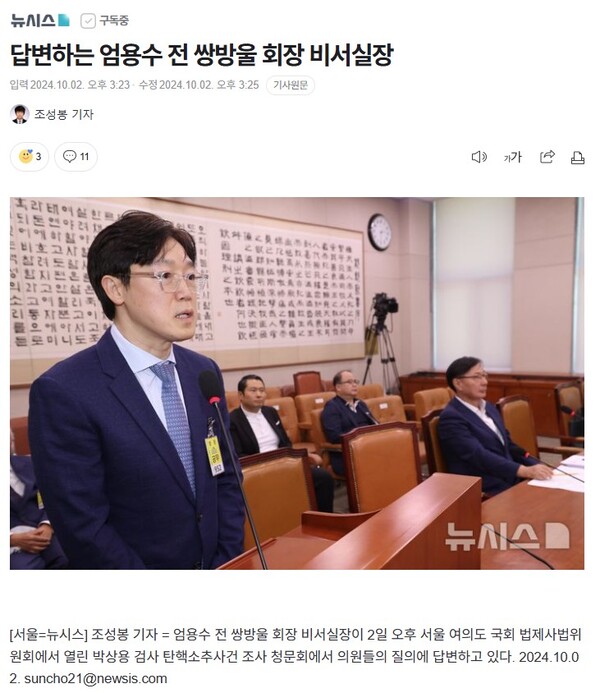 엄 전 실장은 국회 청문회 도중 조 씨에게 카카오톡 메시지를 보내기도 했다. <워치독>이 입수한 조 씨와 엄 전 실장의 메시지 내용에 따르면, 엄 전 실장은 지난해 10월 2일 오후 4시 51분과 4시 52분 카카오톡 메시지를 통해 자신이 청문회에 나온 <뉴시스> 사진 기사 2건을 조 씨에게 보냈다. 뉴스 기사 전송은 청문회가 진행 중이었던 때에 이뤄졌다.
