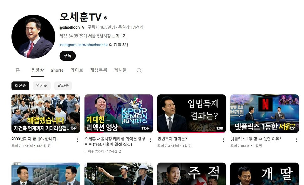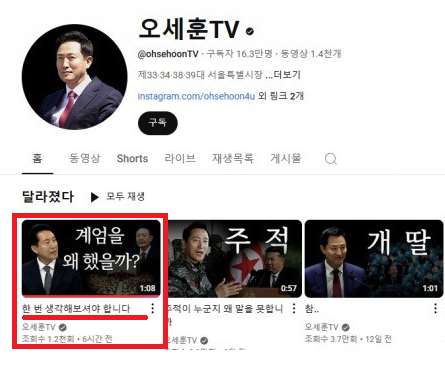 서울시정을 홍보하는 유튜브 채널 ‘오세훈 티브이(TV)’가 ‘계엄 옹호’ 논란에 휩싸였다. 계엄을 옹호하는 제목의 영상을 올렸다가 논란이 일자 섬네일 제목을 바꿨다.