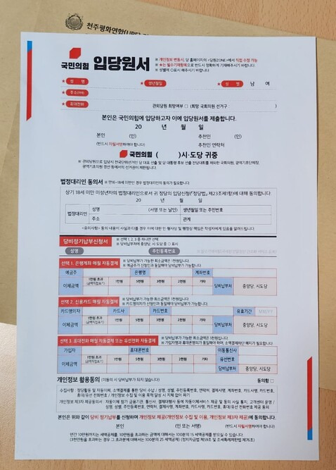 ㄱ씨는 천주평화연합 봉투에 담겨져 있었다는 국민의힘 입당 원서를 사진 형태로 한겨레에 공개했다. 이 입당 원서는 상단에 ‘관외 당원 희망 여부’ 등을 체크하게 돼 있는 2022년 형식으로 현재 국민의힘 누리집에서 내려받을 수 있는 서식과는 차이가 있다. 몇몇 교인들에겐 2022년 12월17일 국회 의원회관에서 열린 ‘국민의힘 책임당원 전국연대 출범식’ 초청장도 전달된 것으로 알려졌다.