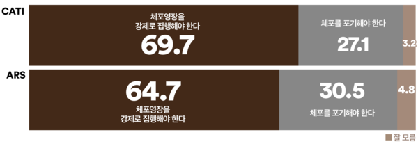 같은 시기에 진행한 ARS 조사에서는 ‘강제로 집행해야 한다’ 64.7% 대 ‘체포를 포기해야 한다’ 30.5%로, 34.2%p의 격차를 보였다.