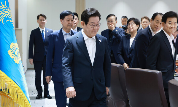 ‘사면’ 원포인트 임시 국무회의 연 이 대통령 이재명 대통령이 11일 용산 대통령실 청사에서 열린 8·15 광복절 특별사면 대상자 확정을 위한 ‘원포인트’ 임시 국무회의에 입장하고 있다. 이날 정부는 자녀 입시비리 등으로 실형을 선고받고 수형 생활을 해온 조국 전 조국혁신당 대표를 포함한 83만6687명에 대해 15일자로 특별사면을 단행한다고 밝혔다. 김창길 기자
