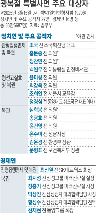 특별사면·복권 대상에는 잔형 집행이 면제되는 조 전 대표와 백원우 전 대통령실 민정비서관, 홍문종·정찬민·하영제 전 의원 등 정치인·전직 주요 공직자 27명, 최신원 전 SK네트웍스 회장 등 경제인 16명이 포함됐다.