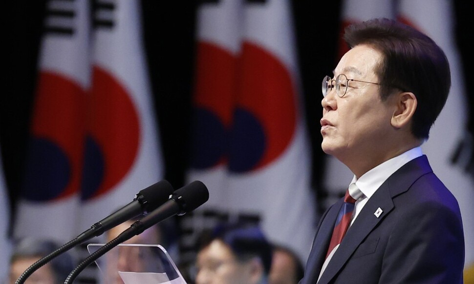 이날 이 대통령 경축사의 주된 화두는 ‘공존’과 ‘평화’였다. 12차례 평화를 언급한 이 대통령은 지난 정부에서 악화된 남북관계를 차근차근 풀어나가야 한다는 뜻을 분명히 했다. 그는 “먼 미래를 말하기에 앞서 지금 당장 신뢰 회복과 대화 복원부터 시작하는 것이 순서”라며 “국민주권 정부는 취임 직후부터 전단 살포 중단, 대북 확성기 방송 중단 등의 조치를 취했다”고 말했다. 또 “우리 정부는 실질적 긴장 완화와 신뢰 회복을 위한 조치를 일관되기 취해나갈 것”이라고 강조했다.