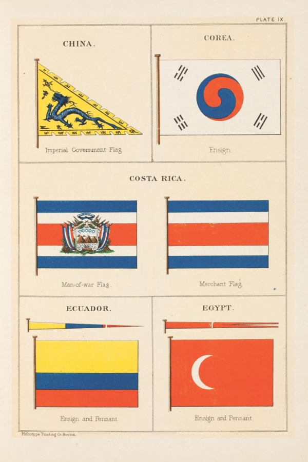 이후에도 1883년 영국과 수호조약을 맺을 때, 1886년에 프랑스와 수교를 했을 때에도 태극기를 사용했습니다. 당시 조선이 제공한 태극기가 그들의 외교문서에 그대로 남아 있어요. 1883년 미국에서 루시어스 푸트 공사를 조선에 파견한 것에 대한 답례로 민영익과 홍영식 등의 보빙사가 미국에 파견되었습니다. 이들은 9월 19일 숙소였던 보스턴의 호텔에 처음으로 태극기를 걸었어요.