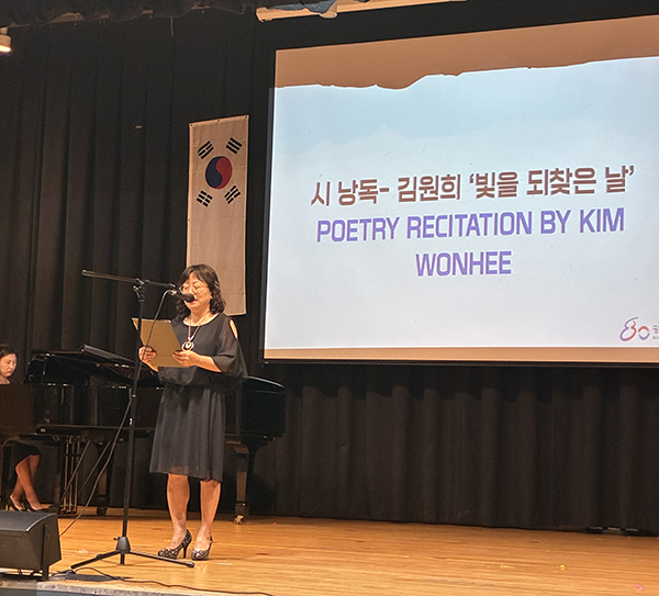 기념사에 이어 시낭독 순서는 독립유공자의 후손이며 캐나다 한인문인협회 회원인 김원희 시인이 광복의 기쁨과 감동을 담은 시 ‘빛을 되찾은 날’을 피아노 반주로 낭송했다.