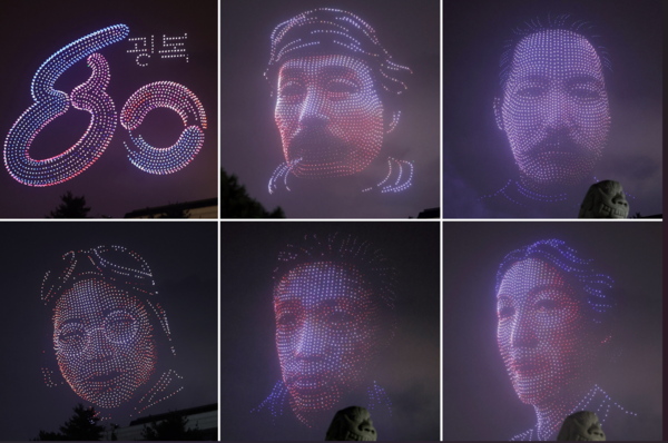 14일 서울 여의도 국회의사당에서 열린 '제80주년 광복절 전야제'에서 독립 영웅들의 초상을 하늘에 그려내는 대규모 드론쇼가 펼쳐지고 있다. 윗줄 가운데부터 시계방향으로 홍범도 장군, 김좌진 장군, 남자현 선생, 안중근 의사, 권기옥 선생. 2025.8.14. 연합