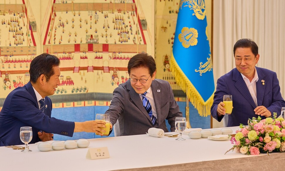 최근 대통령실과 정부 쪽에서는 검찰개혁 입법을 속도전으로 추진했다가 작은 혼란이라도 생길 경우 역풍을 맞을 수도 있다고 보고, 올 연말까지 조금 더 시간을 두고 검찰개혁을 추진해야 한다는 말이 나왔다. 여기에는 정청래 지도부 출범 뒤 민주당이 국민의힘을 대화 상대로 인정하지 않고 일방통행을 하는 듯한 모습이, 최근 이 대통령의 지지율 하락에 영향을 끼쳤다는 판단도 작용했던 것으로 보인다. 이날 이 대통령이 정청래 지도부와 만찬 자리를 마련한 것도 이런 뜻을 우회적으로 전달하기 위한 취지로 읽혔다.