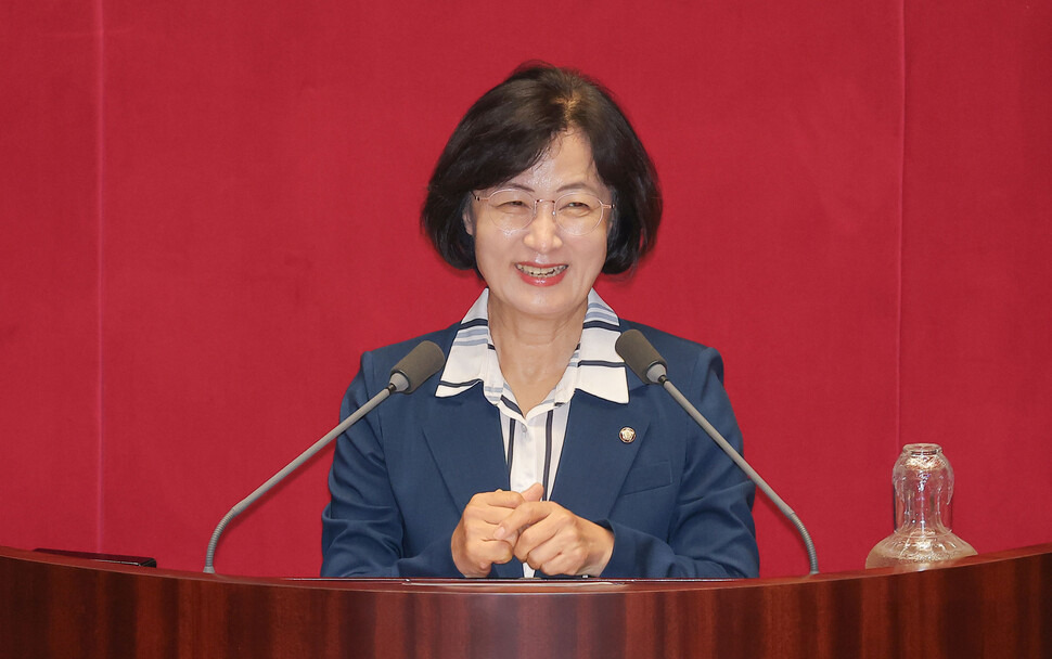 21일 서울 여의도 국회 본회의에서 법제사법위원회 위원장으로 선출된 더불어민주당 추미애 의원이 당선 인사를 하고 있다. 연합