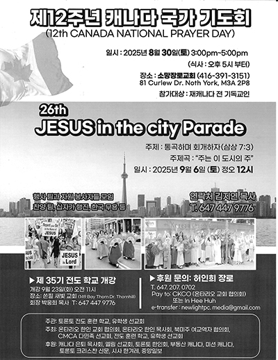 국가기도회에 이어 일주일 뒤인 9월6일(토)은 “예수 그리스도의 사랑”을 외치며 다민족 성도들이 다운타운을 행진하는 제26회‘예수대행진’(Jesus in the City Parade) 2025 행사가 낮 12시부터 다운타운 퀸즈파크 일원에서 열린다.