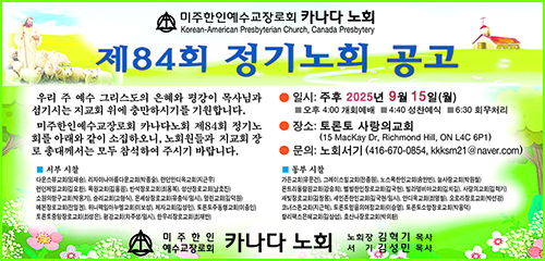 KAPC 미주한인예수교장로회 카나다 노회(노회장 김혁기 토론토사랑의교회 담임목사)는 2025 제84회 정기노회를 9월15일(월) 오후 토론토 사랑의교회(15 MacKay Dr, Richmond Hill, ON L4C 6P1)에서 개최한다.