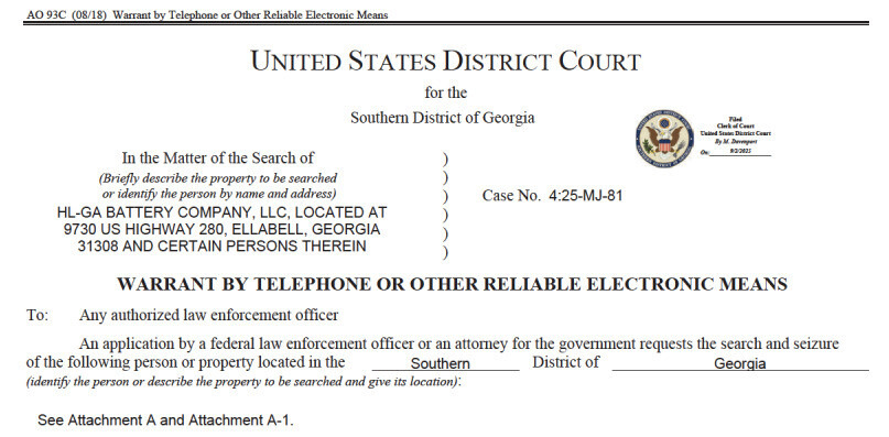 압수할 대상물은 이 대상 구역 안에서 지난 3월 이후 만들어진 인사 관련 자료에 집중됐다. 전현직원의 신분증과 인사 파일, 출퇴근 기록 카드, 급여 지급 자료, 지원서, 이민 관련 서류 등 고용 기록 전반을 압수 대상물로 명시했다. 또한 이들의 고용과 관련해 미국 정부 기관들과 주고받은 서신, 위조 신분증 제조와 구매 관련 자료도 포함됐다. 이와 함께 현대차그룹과 엘지에너지솔루션의 소유와 경영 관련 문서, 계약업체와 하청업체 관련 문서도 압수 대상에 포함했다. 컴퓨터에 저장된 데이터를 삭제했는지 알아보기 위한 접속 기록 등을 꼼꼼히 압수 대상물에 포함했다.