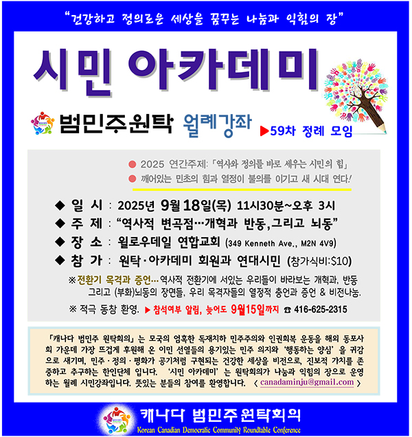 캐나다 범민주원탁회의(Korean Canadian Democratic Community Roundtable Conference)가 연합 정례모임을 겸한 「시민 아카데미」의 제59차 강좌를 9월18일(목) 오전 11시30분부터 노스욕 윌로우데일 연합교회(349 Kenneth Ave. M2N 4V9)에서 시사한겨레 신문사 후원으로 개최한다.