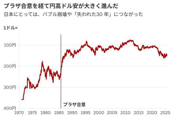 22일은 1985년의 ‘플라자 합의’ 40주년이 되는 날이었다. 일본의 ‘잃어버린 30년’을 촉발시킨 계기가 됐다는 그날을 일본 언론들은 잊지 않았다. 40년 전 그날 뉴욕 센트럴 파크를 내려다보는 플라자 호텔에 모인 G5(미국, 일본, 독일[서독], 프랑스, 영국 등 서방 주요 5개국) 재무장관들은 당시 강세였던 미국 달러 시세를 끌어내리기 위해 일본 등 나머지 나라들이 보유 달러를 팔고 자국 통화를 사들이는 환율 조작 국제협조에 합의했다. 주로 막대한 무역흑자를 보고 있던 일본과 독일을 겨냥한 것이었다. 당시 미국은 천문학적인 무역적자와 재정적자(‘쌍둥이 적자’)에 시달리고 있었다.