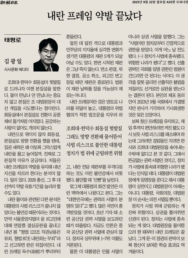 방가조선일보 김광일 논설위원은 9월 21일에 ‘내란 프레임 약발 끝났다’고 썼다. 그간 언론 내란 수괴로 의심받는 방가조선일보가 내란은 없었고 프레임만 있다는 식의 주장으로 흉악한 정체를 드러낸 것이다. 이들이 사설이나 칼럼에서조차 언론의 ‘품격’을 차버린 지는 오래다. 김 씨는 ‘정치가 법 위에 군림하면 위험’하다는 말씀으로 훈계하시려 들지만 이들의 말에 귀를 기울일 사람은 없다. 정확하게 말하자면 정치뿐 아니라 누구도 법 위에 군림하면 위험하다. 윤석열 일당의 내란 시도야말로 정치를 핑계 삼아 법 위에 군림하는 것을 넘어 국민의 재산과 생명을 위협한 가장 위험한 사례였다.