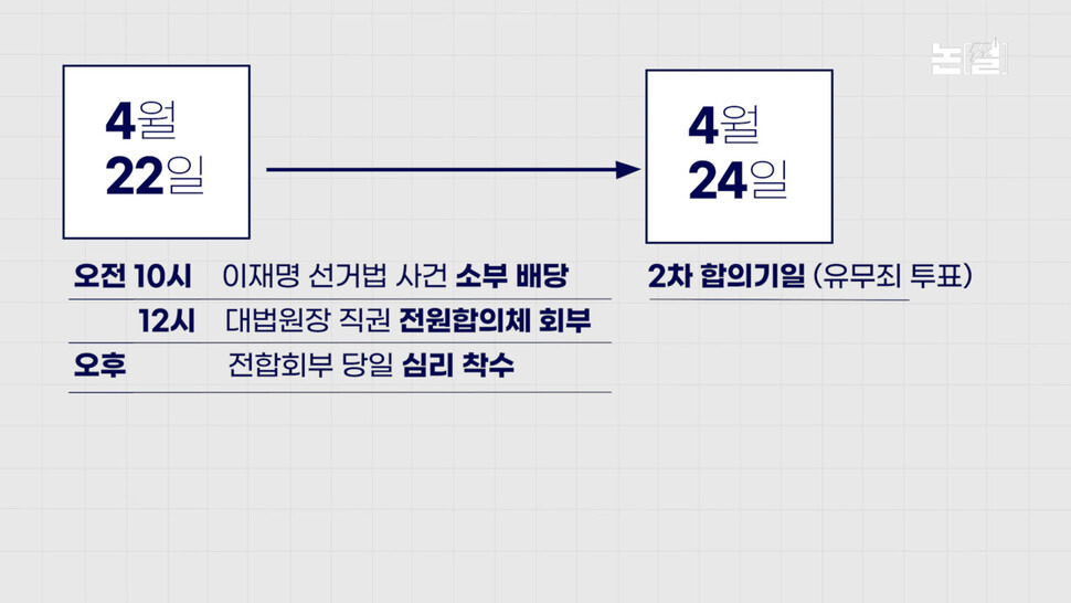 실제 지난 5월1일 나온 대법원의 공직선거법 판결에 국민들이 충격과 분노를 느낀 이유는 단순히 2심 무죄를 유죄로 바꿨기 때문이 아닙니다. 대법원은 이 사건을 소부 배당 2시간 만에 전원합의체(전합)에 넘기고, 전합 회부 당일 심리에 착수합니다. 또 통상 한달에 한번인 합의기일을 이틀 만에 연속으로 열어 곧바로 투표로 유무죄를 정했습니다. 7만쪽 가까운 사건 서류를 다 읽는 건 고사하고 목록과 제목만 일별하기에도 벅찬 시간입니다. 한마디로 대법원 역사상 유례를 찾을 수 없는 급발진과 졸속의 연속이었습니다. 적법 절차를 무시하고 밀어붙인 사실상의 직권남용입니다.