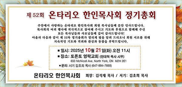 온타리오 한인목사회(회장 김석재 순복음영성교회 담임목사)는 제52회 2025 정기총회를 오는 10월21일(화) 오전 11시 토론토 영락교회(담임 전대혁 목사: 650 McNicoll Ave. Toronto, ON, M2H 2E1)에서 개최한다.
