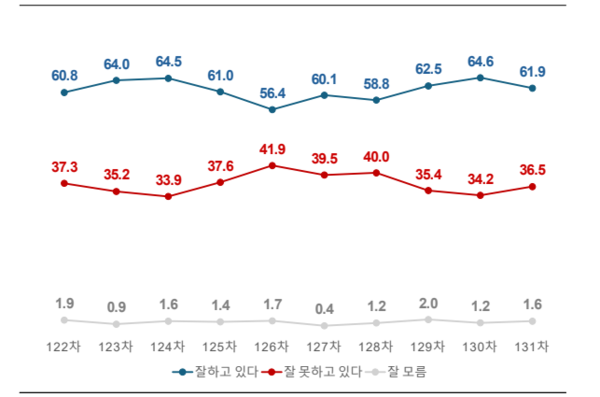ARS조사에선 ‘긍정’ 61.9%(2.7%p↓), ‘부정’ 36.5%(2.3%p↑)