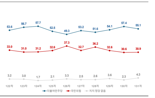 ARS 더불어민주당 55.1%, 국민의힘 30.9%(격차 24.2%p)
