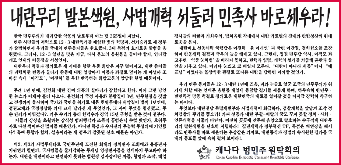 12.3 내란사태 발생 1년을 맞아 캐나다 범민주원탁회의(Korean Canadian Democratic Community Roundtable Conference)가 단호한 내란척결을 거듭 촉구했다.