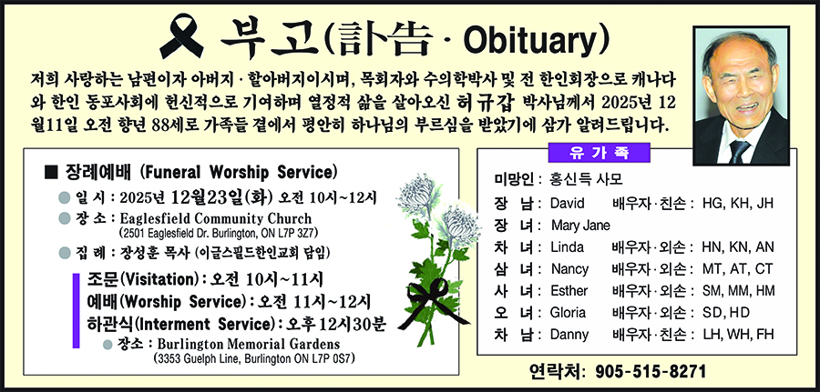 장례는 12월23일(화) 고인이 신앙생활을 하던 벌링턴 이글스필드 한인교회(담임 장성훈 목사: 2501 Eaglesfield Dr. Burlington ON L7P 3Z7)에서 오전 10시부터 조문, 11시 장례(발인)예배를 드리며, 하관예배는 낮 12시30분 Burlington Memorial Gardens에서 드린다.