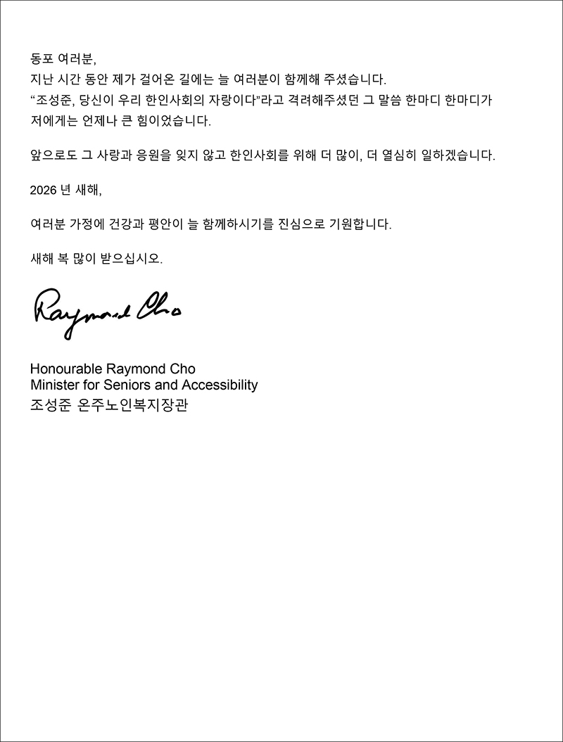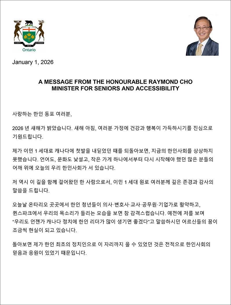 조 장관은 아울러 “2026년에도 노인복지부 장관으로, 그리고 온타리오 주의원으로 한인사회와 온주민들을 위해 더욱 열심히 일하겠다.”고 다짐했다.