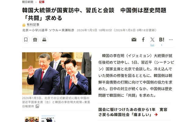 아사히는 다카이치 사나에 총리 '대만유사' 관련 발언 이후 "중일 대립이 이어지고 있는 가운데, 중국이 한국에 대해 역사문제에서 대일 공동투쟁을 요청했다"고 전했다.