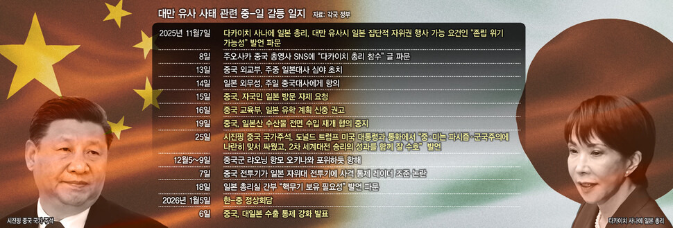 중국이 일본에 대한 압박을 더욱 강화하는 것은 중국이 가장 민감하게 여기는 사안인 ‘대만 문제’에 대해 물러서지 않겠다는 경고로 해석된다. 중국은 지난 11월 초 다카이치 사나에 일본 총리의 ‘대만 유사시 집단적 자위권 행사 가능’ 시사 발언이 중국에 대한 ‘내정 간섭’이라며 발언 철회를 요구해왔다. 대만 문제는 중국에 있어 물러설 수 없는 ‘레드라인’(한계선)이라는 것이다. 이에 중국인의 일본 방문 자제 방침, 일본 문화콘텐츠의 유입 제한 등에 나섰지만 중국은 “더 쓸 수 있는 카드”가 있다며 압박했고, 초강경책으로 여겨졌던 이중용도 품목의 수출 금지 카드까지 꺼냈다.