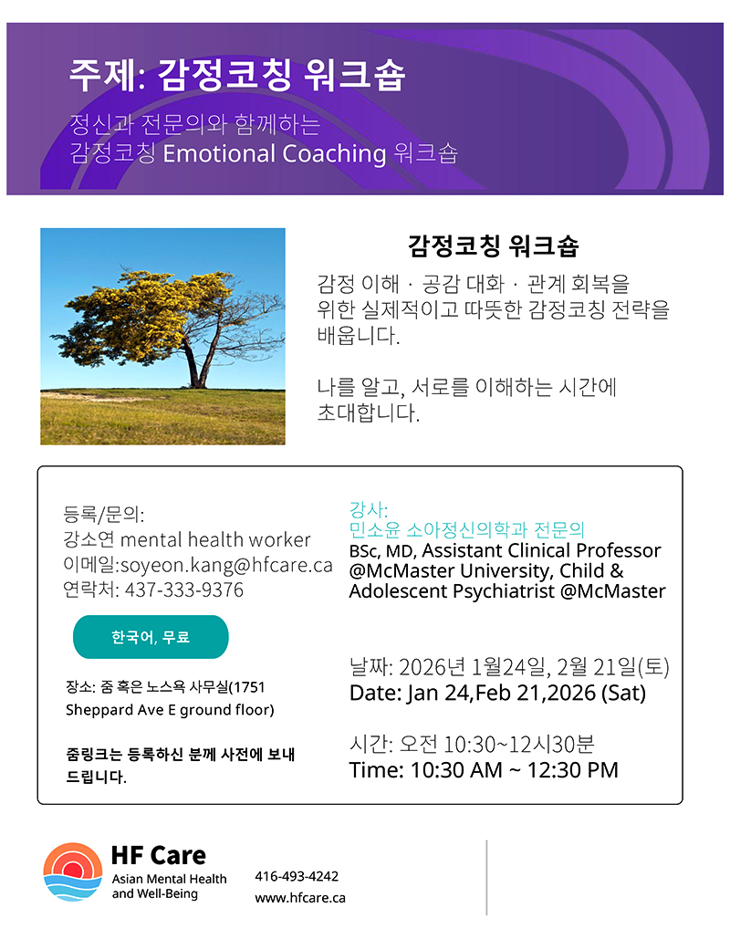 HF Care(구 홍푹정신건강협회)는 2026 새해 두번째 웰니스 세미나(Wellness Seminar)로 ‘감정코칭(Emotional Coaching)’주제의 한국어 무료 대면 및 온라인 워크숍을 오는 1월 24일과 2월 21일 토요일 오전 10시 30분부터 12시30분까지 협회사무실(1751 Sheppard Ave East)에 직접 참석하거나 줌으로도 참여할 수 있는 하이브리드로 진행한다.