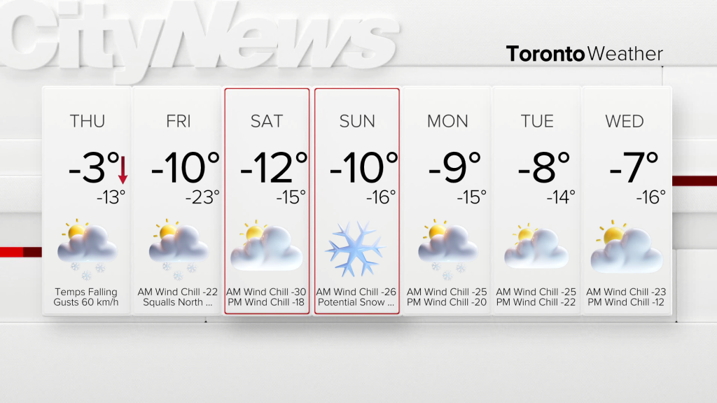 23일 GTA 일대 기온이 올 겨울 들어 가장 추운 날씨에 돌입, 토요일 24일 아침에는 “생명을 위협하는” 체감온도에 이를 것이라고 기상당국이 경고했다. 이어 일요일 25일에는 눈보라가 강타한다는 예보여서 이번 주말은 올 시즌 최악의 날씨를 기록할 전망이다.