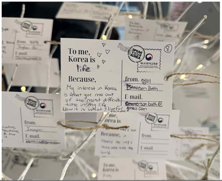 이날 행사에서 특히 눈길을 모은 것은 학생 참여형 ‘메시지트리(Message Tree)’활동이었다. 학생들은 메시지 트리에“한국은 나에게 ( )이다, 왜냐하면 ( )”문장을 완성해 자신의 생각을 공유했다.