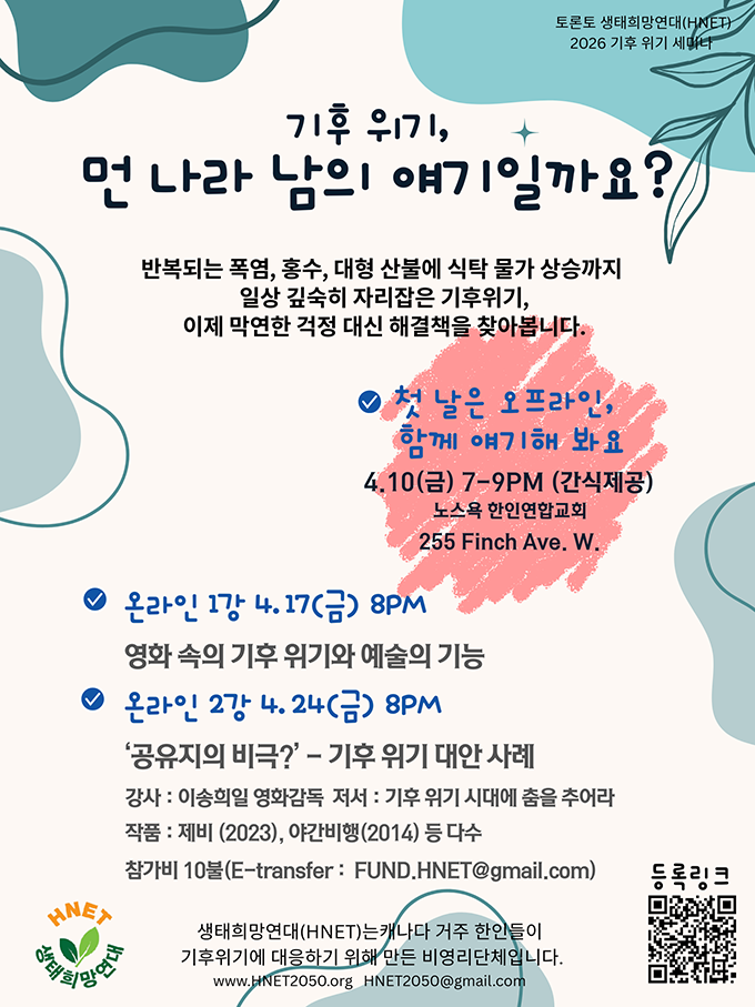 토론토 생태희망연대(HNET: 대표 정필립)가 ‘기후위기, 먼 나라 남의 얘기일까요’ 라는 주제의 온/오프라인 세미나를 오는 4월10일(금) 부터 3주 동안 3회에 걸쳐 진행한다고 밝혔다.