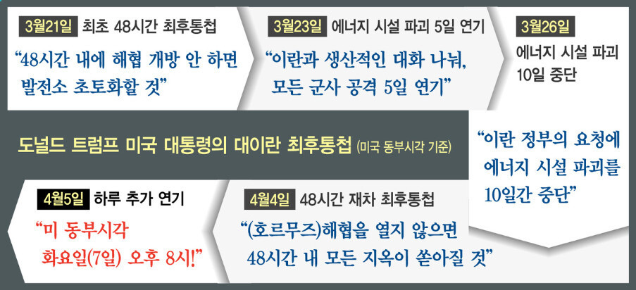 트럼프 대통령이 일종의 ‘최후통첩’을 처음 내놓은 건 지난달 21일(현지시각)이다. 그는 이란에 호르무즈해협 완전 개방을 요구하며 응하지 않을 경우 “48시간 안에 이란 발전소를 초토화하겠다”고 했다. 하지만 이틀 만인 지난달 23일 공격을 5일간 유예했다. 이어 새 공격 시한을 하루 남겨둔 지난달 26일 “이란 발전소에 대한 공격 유예를 4월6일 오후 8시(미 동부시각 기준·한국시각으로 7일 오전 9시)까지 10일 연장한다”고 또 늦췄다. 이어 두 번째 마감 시한(6일)을 이틀 앞둔 지난 4일 “지옥문이 열릴 때까지 48시간 남았다”며 몰아붙이더니, 바로 다음날(5일) “화요일(7일) 오후 8시”로 시한을 하루 더 연장했다.