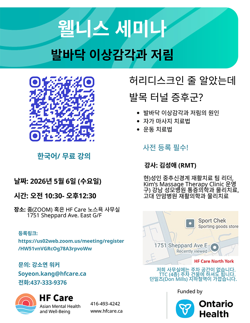 ● 한인사회 HF Care, 5월2일 "발바닥 이상 감각과 저림" 주제 웰니스세미나 시사한매니져 2026. 4. 18. 11:47 김성애 물리치료사 진행, 오전 10시30분 부터 한국어 무료 On-Off로 HF Care(구 홍푹정신건강협회)는 오는 5월6일(수) 웰니스 세미나(Wellness Seminar)의 하나로 ‘발바닥 이상감각과 저림’주제의 현장 및 ON Line 한국어 무료강좌를 오전 10시 30분부터 낮 12시30분까지 진행한다. 이번 세미나는 “발바닥 이상감각과 저림- 허리 디스크인 줄 알았는데 발목터널 증후군?”이라는 내용으로, 발바닥 이상감각과 저림의 원인, 자가 마사지 치료법, 운동치료법 등에 대해 알아본다. 강사는 Registered Massage Therapist 김성애 물리치료사(성인 중추신경계 재활치료팀 리더, Kim’s Massage Therapy Clinic, 전 고대안암병원 재활의학과 물리치료사)가 맡는다. 세미나 참석을 원할 경우 협회사무실(1751 Sheppard Ave East)에 직접 참석하거나 온라인 줌으로도 참여할 수 있는 하이브리드로 진행한다. 반드시 사전등록 해야한다. 줌 접속 링크는 https://us02web.zoom.us/meeting/register/HW51vnVGRcOg78A3rpvoWw 이다. HF Care는 “전문가와 함께 무료로 진행하는 웰니스 하이브리드 세미나에 많이 참석하셔서 건강하고 활기찬 삶을 설계하시기 바란다”고 밝히고, 차량 편으로 현장 참석할 경우 협회사무실에는 주차공간이 없으므로 DonMills 지하철역 TTC 주차건물을 사용하기 바란다고 전했다. < 문의 및 등록: 416-493-4242/437-333-9376, 강소연 mental health worker, soyeon.kang@hfcare.ca > 저작자표시 비영리 변경금지 (새창열림)